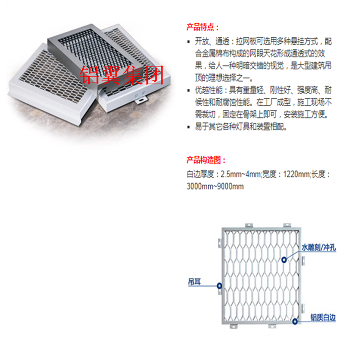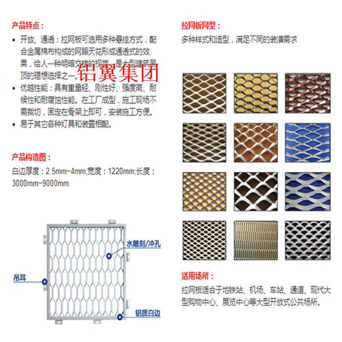 專業生產鋁拉網板、鋁板網、玻璃棉氈鋁板網吸聲墻面、鋁板沖孔網廠家,經驗豐富,按圖均可定制。 鋁網板、沖孔鋁板、拉網天花、鋁拉網幕墻、拉伸鋁網、鋁拉網吊頂、幕墻鋁板網等,款式齊全,按圖定制生產。沖孔網鋁板定制孔型:長孔、圓孔、方孔、三角孔、魚鱗孔、橋式孔、菱形孔、五角孔、六角孔、八孔、十字孔、指甲孔、梅花孔、人字孔、及其它異形孔。鋁翼集團集研發、設計、生產、定制及銷售服務為一體的大型拉網鋁單板生產廠家,注冊資金3180萬元,工廠總占地面積約30萬平方,真正的實力廠家,接大單急單有優勢。 實力廠家更值得信賴,源頭工廠直銷價格更優惠,歡迎詢價,歡迎蒞臨公司注冊地實地考察!